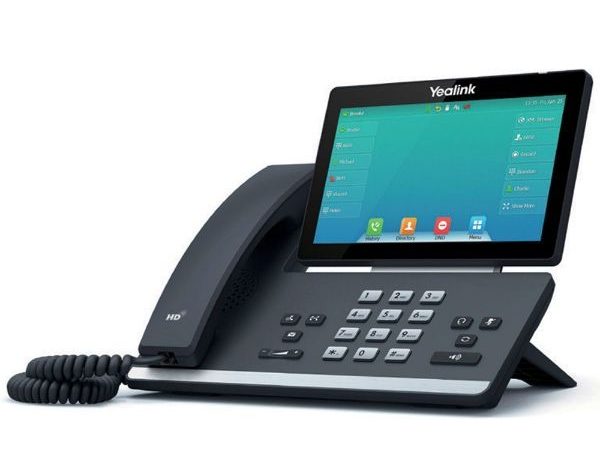 Téléphone IP haut de gamme avec écran tactile et caméra.